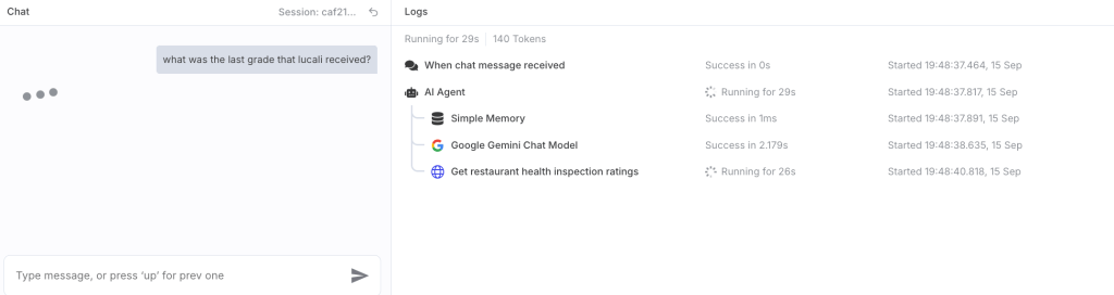 I initially started from the simple n8n AI agent template, and replugged the Get HTTP request node, with the API from DOHMH New York City Restaurant Inspection Results. Although I had hoped that this would work quite similarly to my successful MTA bus assistant, I found several issues in streaming the data due to the volume of records & spent a lot of time reviewing data quality of the results.